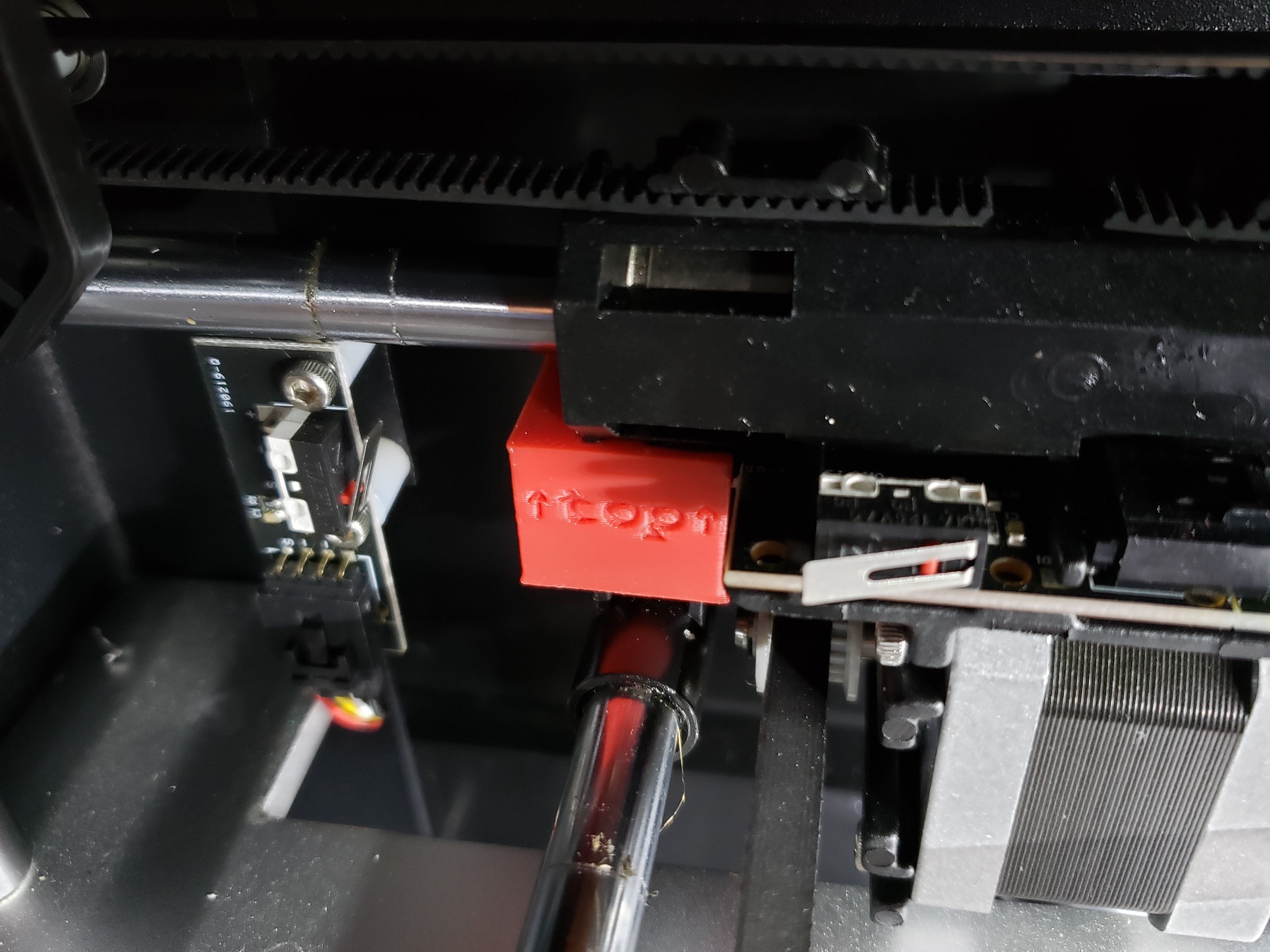 This scheme keeps the cable from falling onto the heated bed, where it will surely be torn to pieces.Some details
