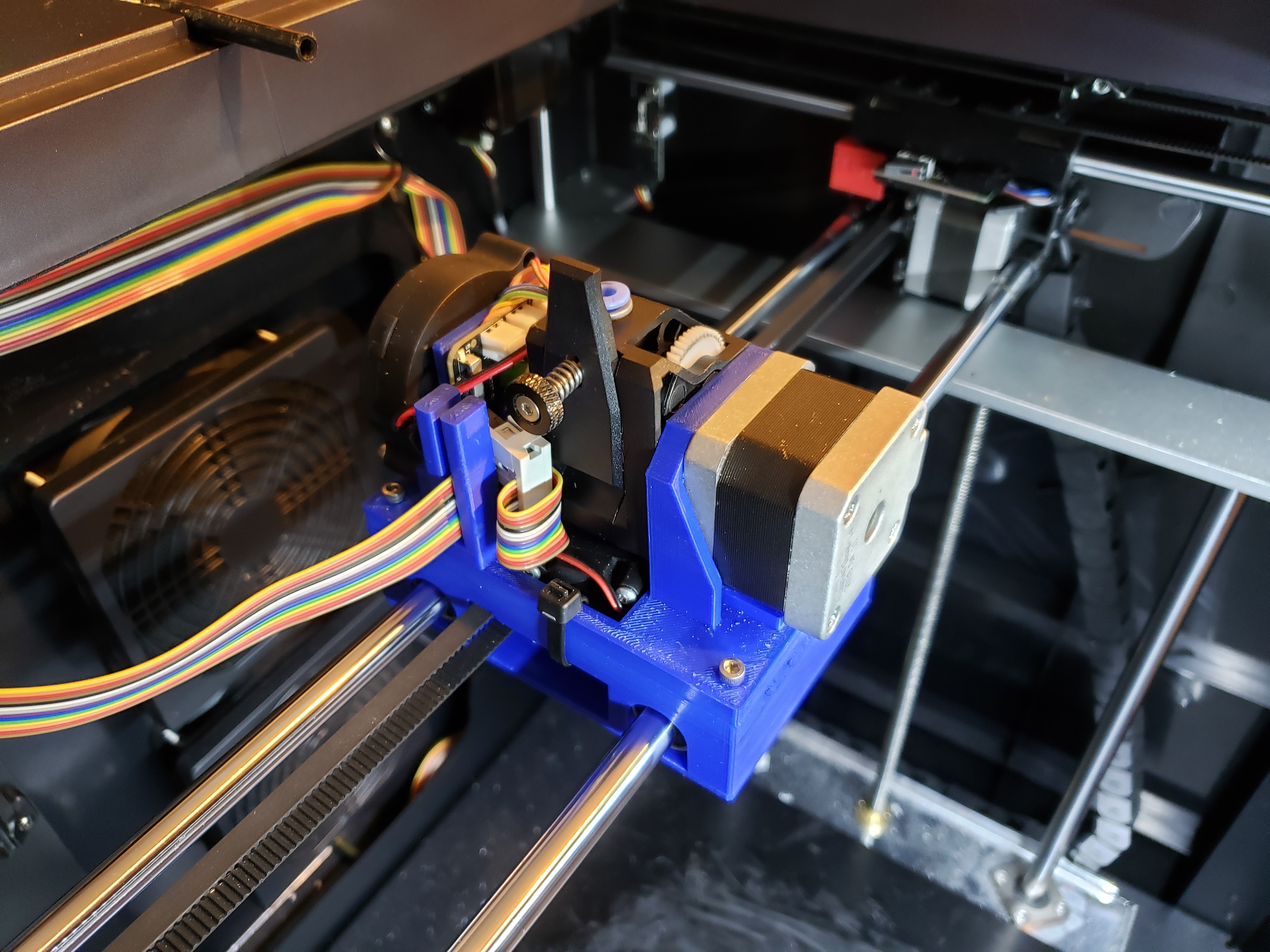 - I located and 3D printed this Thingiverse project for the extruder mounting (it seems many people have replaced Qidi Tech's extruders).