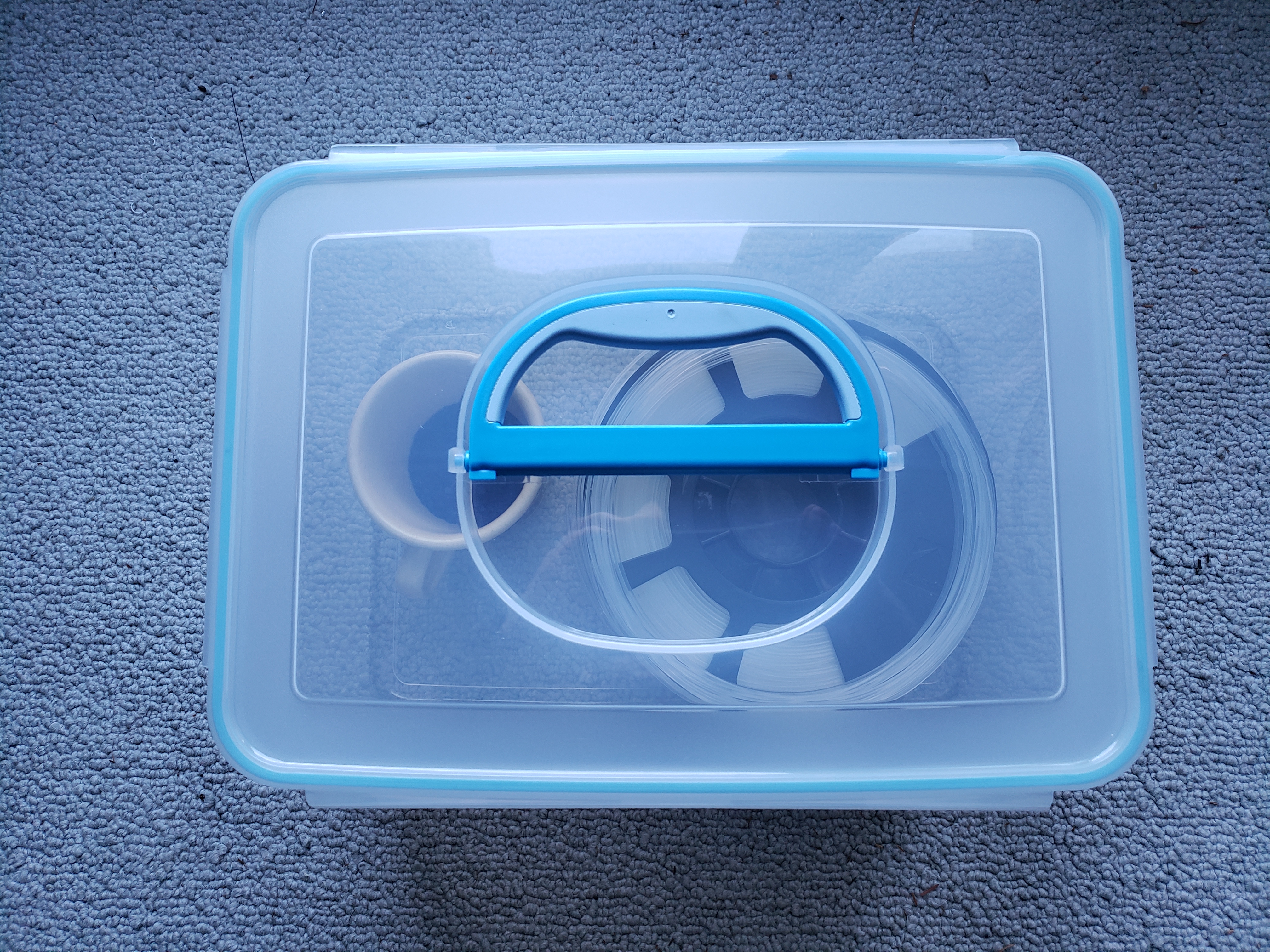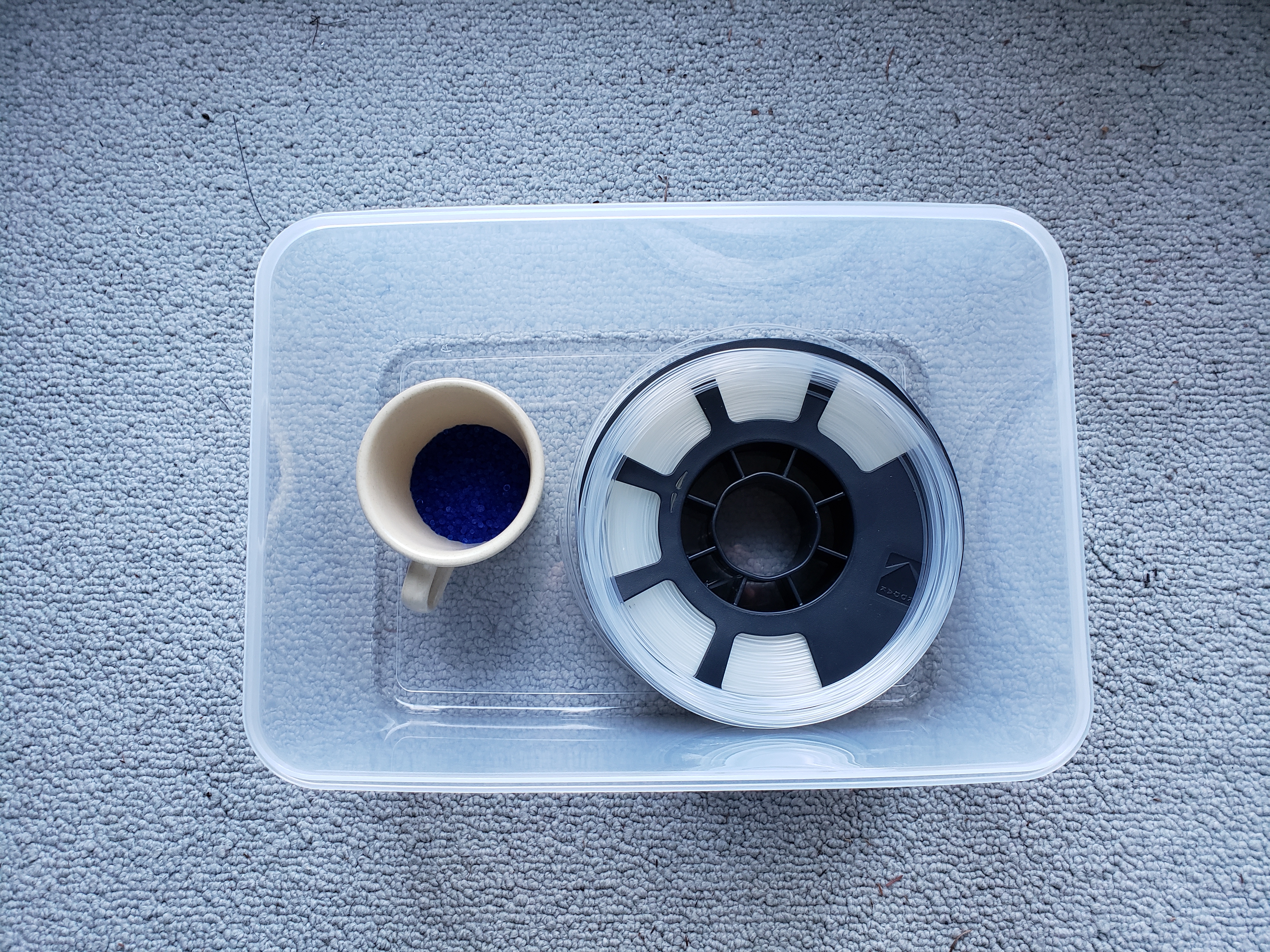 Figure 7: Dehydrating filament storage: airtight box and silica gel (blue beads in cup)