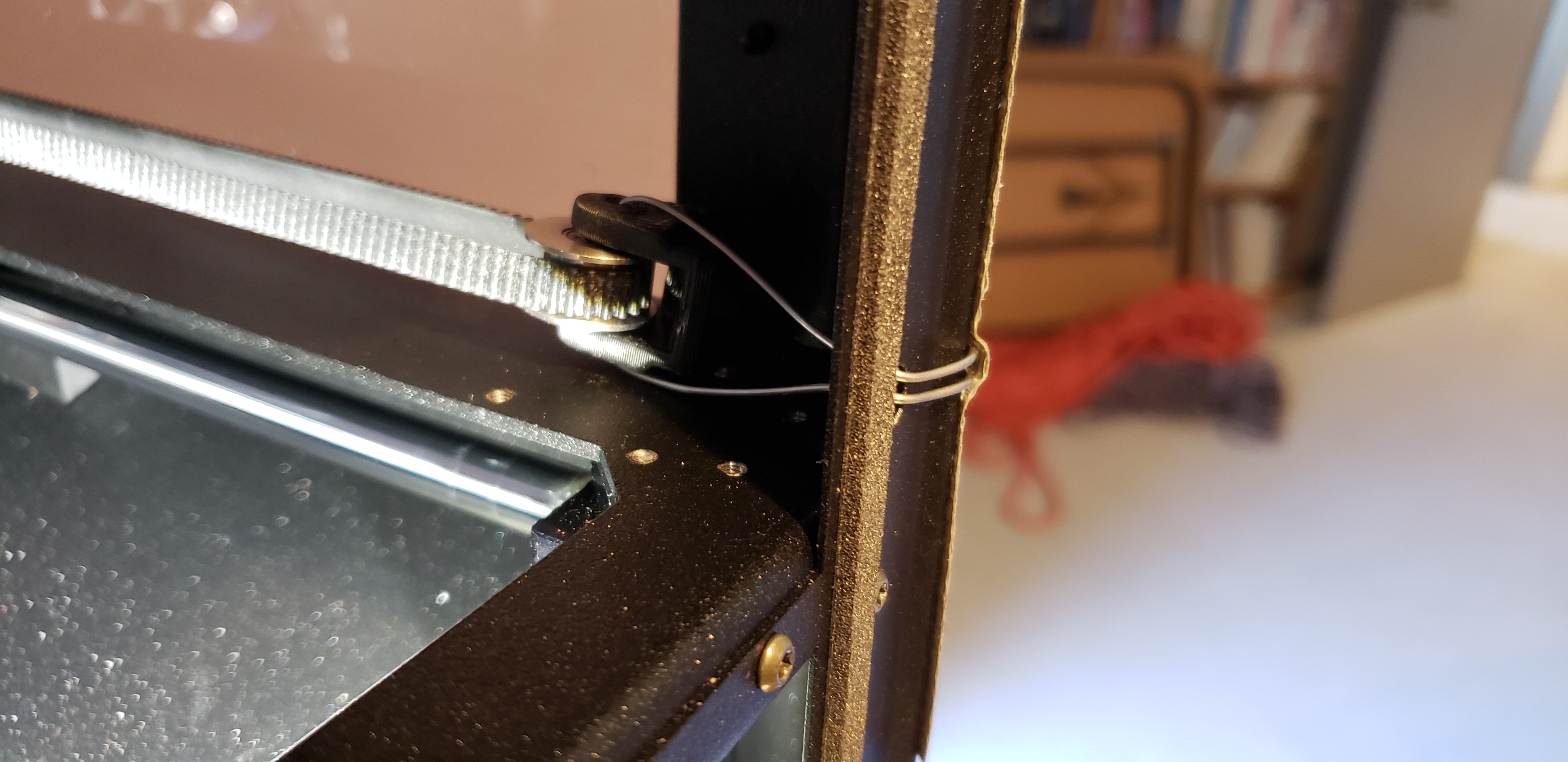 Jury-rigged belt tensioner (click for full size)So the moral of the story is — print spare parts before they're needed. And keep some baling wire handy, just in case.