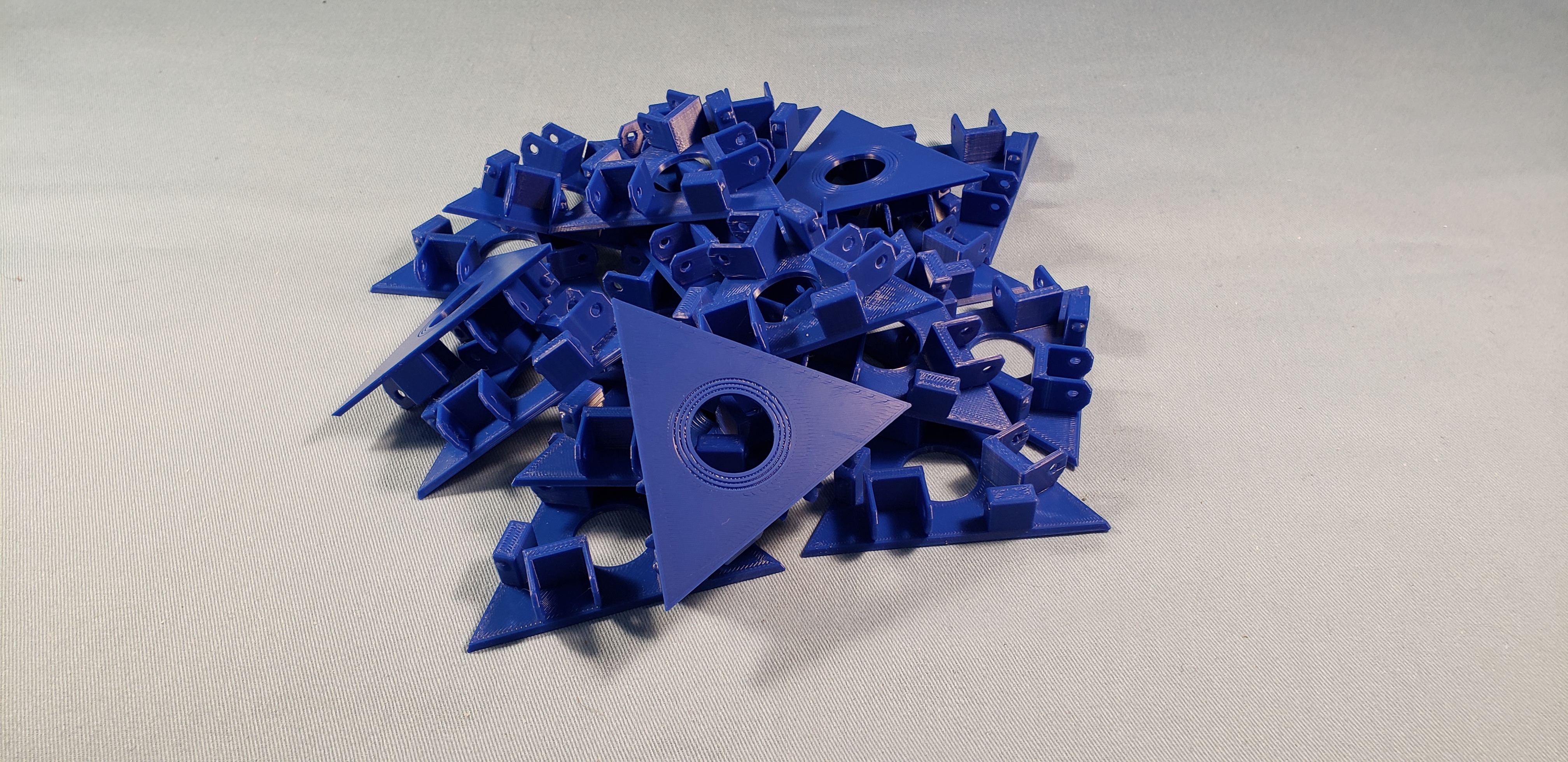 Icosahedron: Python source (GPL licensed) / STL. This is a 20-sided polyhedron using my mechanical fasteners to unite 20 triangular sections. To create it, one simply prints 20 copies of a single prototype object, then assembles them: