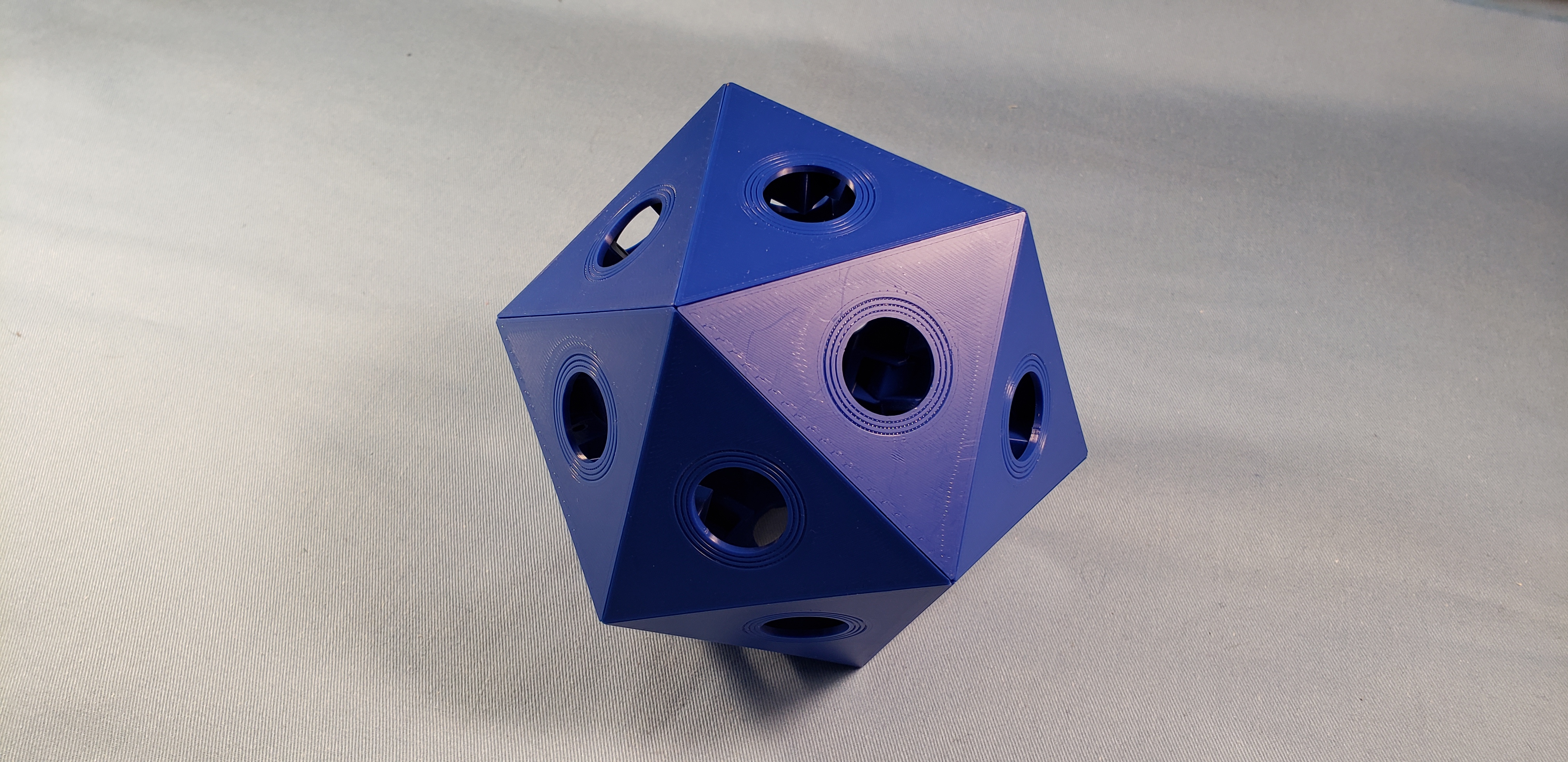 - Icosahedron (20-sided object): SolveSpace / STL. Twenty sides, each with 3 magnets: 60 magnets. This variation is a work in progress.