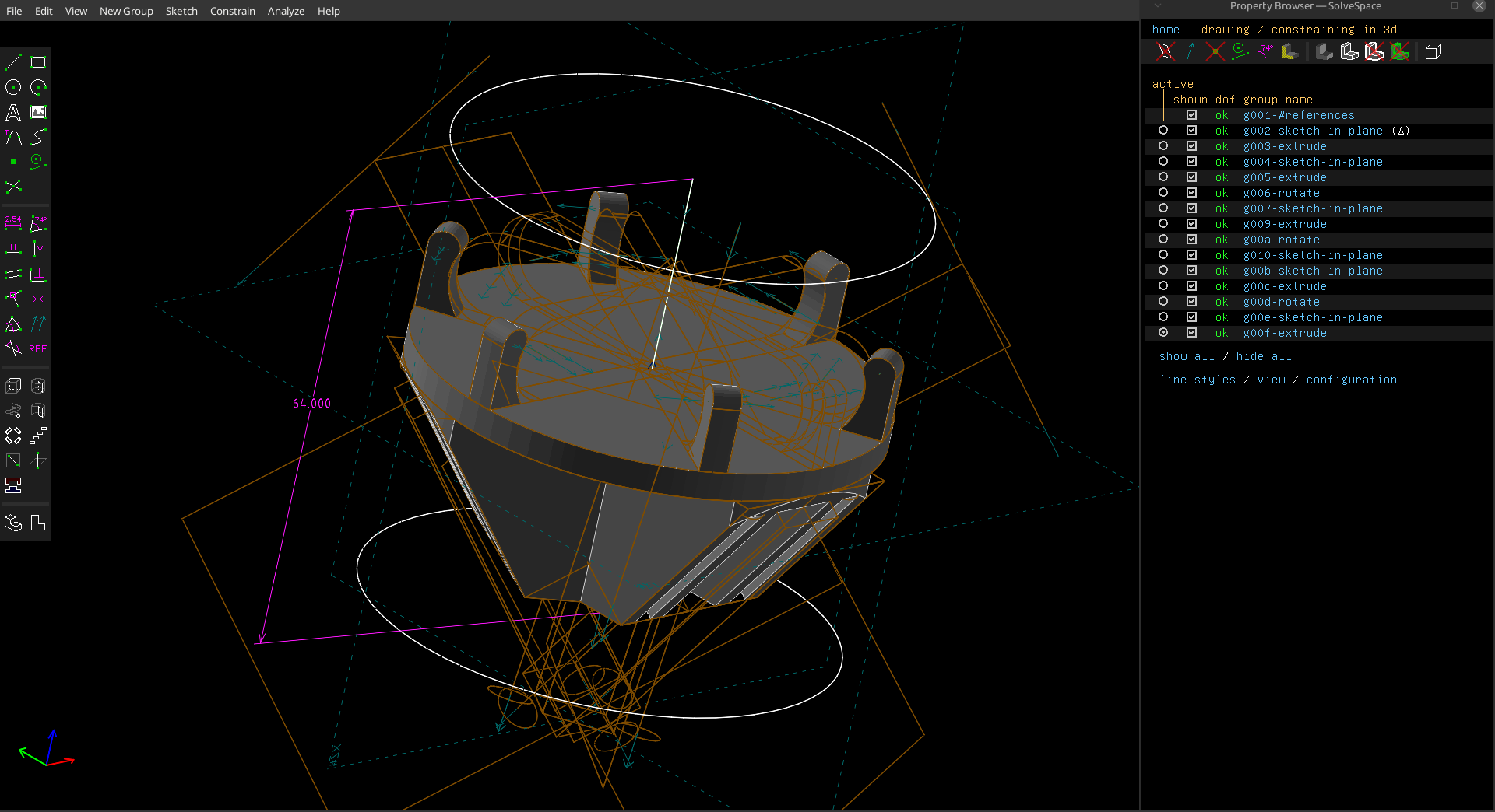 Camera Mount design in SolveSpace (click for full-size)Many alternatives to SolveSpace exist, but most are either too buggy and hard to use (FreeCAD), or they own both you and your projects (Fusion 360). SolveSpace has a rather steep learning curve and is missing some features many people regard as important (like the ability to create numeric dimensioning variables), but it's both free and pretty good. It's more than adequate for projects like those in this article.