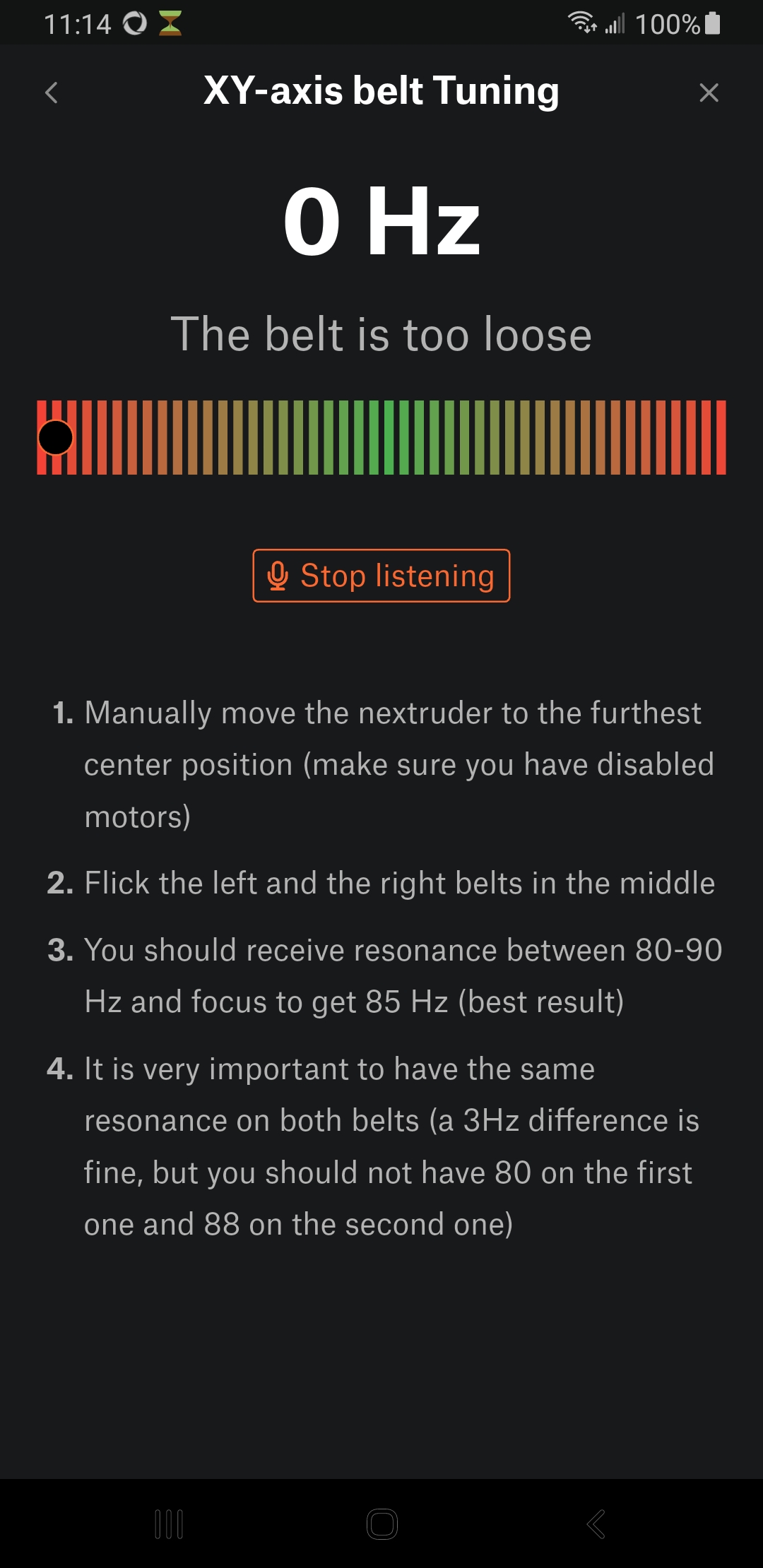 Again, the Prusa Mobile app includes a way to measure the belt frequency, but it's not very good. It may take an unconscionably long time to respond to signals, meanwhile telling you that:
