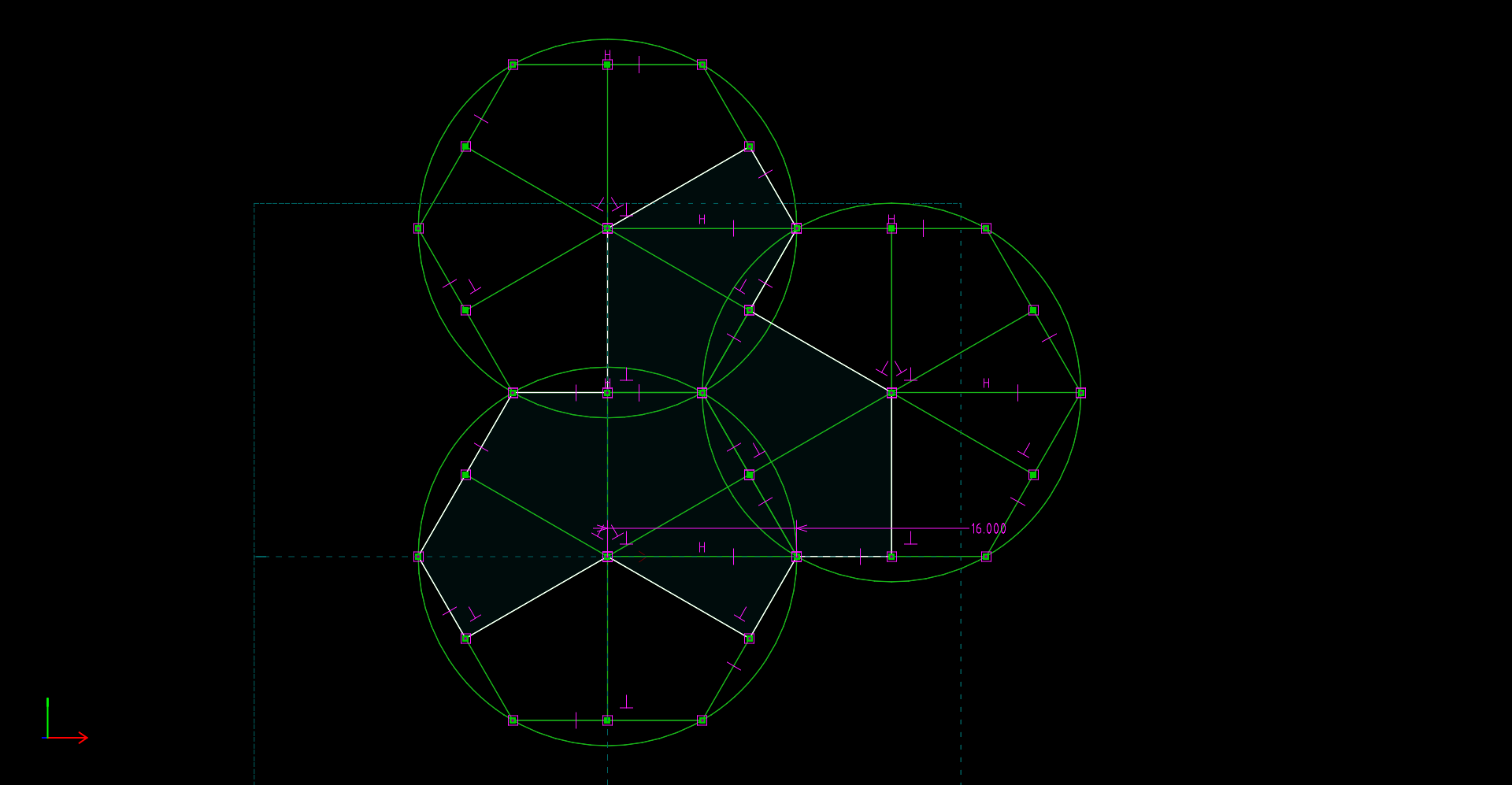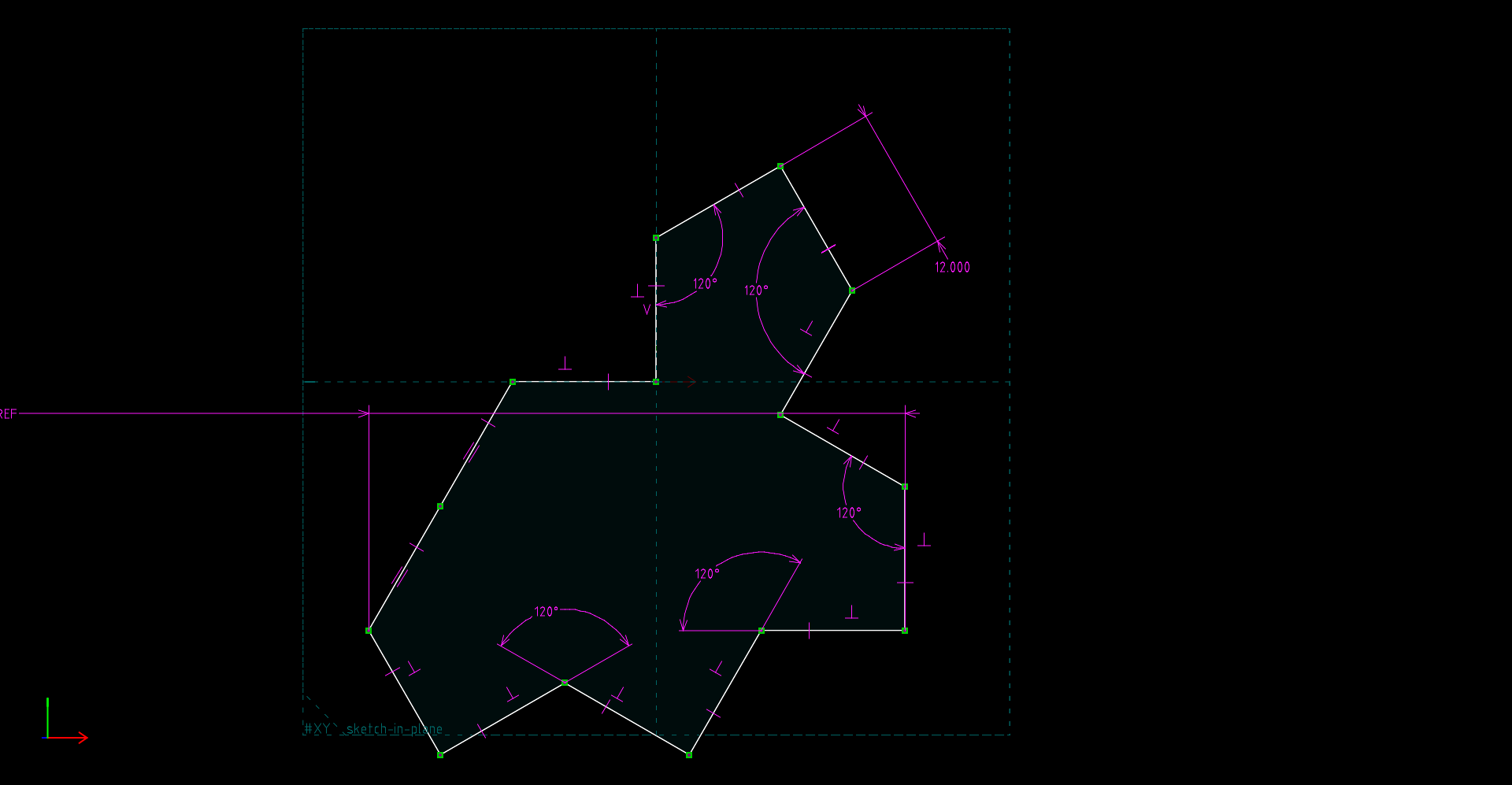 • Aperiodic Tile version 1 — This is a printable aperiodic tile as explained in this Scientific American article. Unlike Spectre below, this aperiodic tile version requires that the tile's mirror image be used at times. In this SolveSpace design, three hexagons are constructed, then the perimeter of the tile is created using coordinates provided by the hexagons. Click here for an image of the key sketch. Notice that the majority of the lines are construction lines, meaning lines that provide dimensioning/geometry but don't become part of the exported sketch.