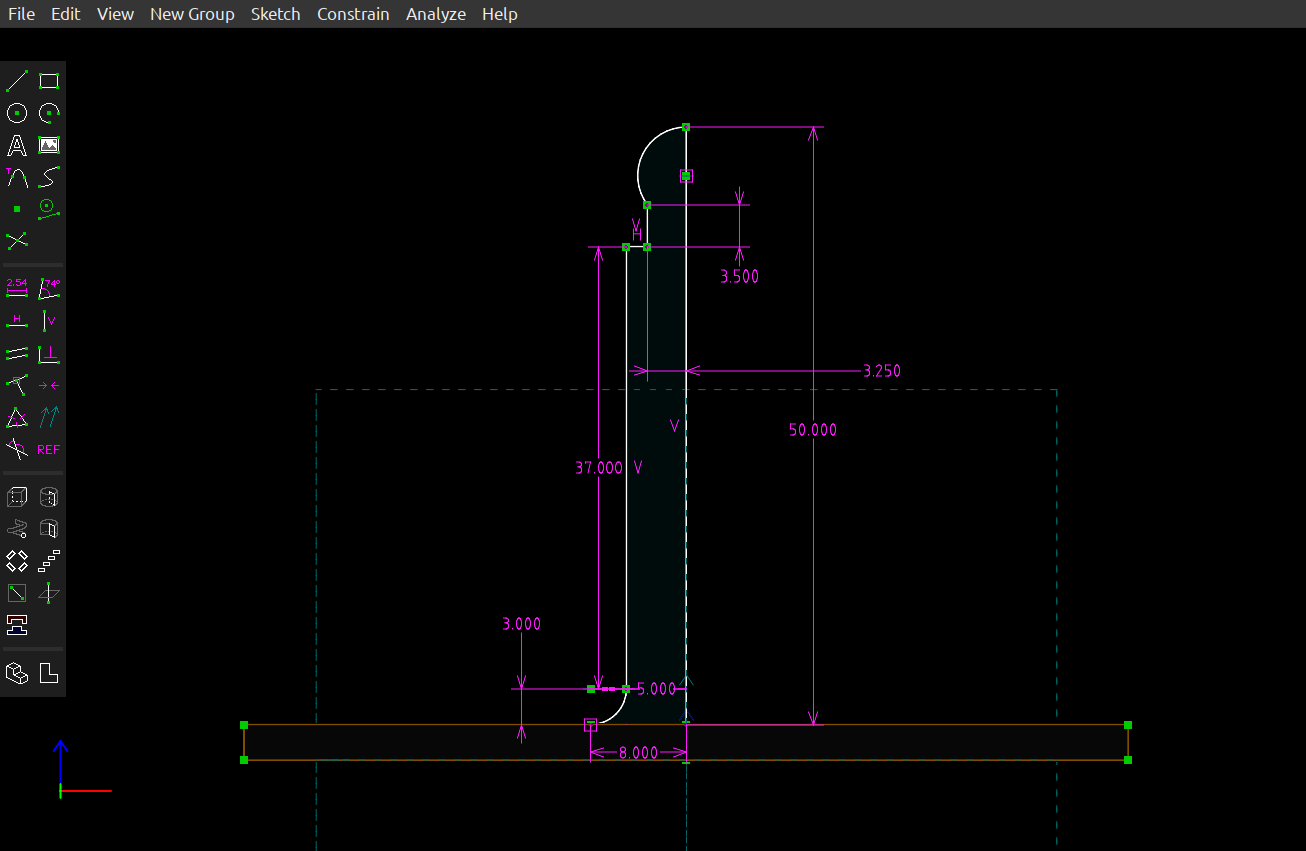 In this phase, the user creates some two-dimensional sketches of the desired object. The lines and curves in the sketch must be fully described — each line has a length and position, each curve has an arc length, and so forth. This description process is called "constraining". Figure 4 shows a "fully constrained" sketch — all the drawing elements and their relationships are described without ambiguity.