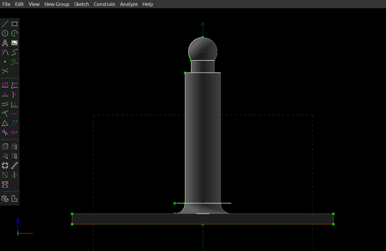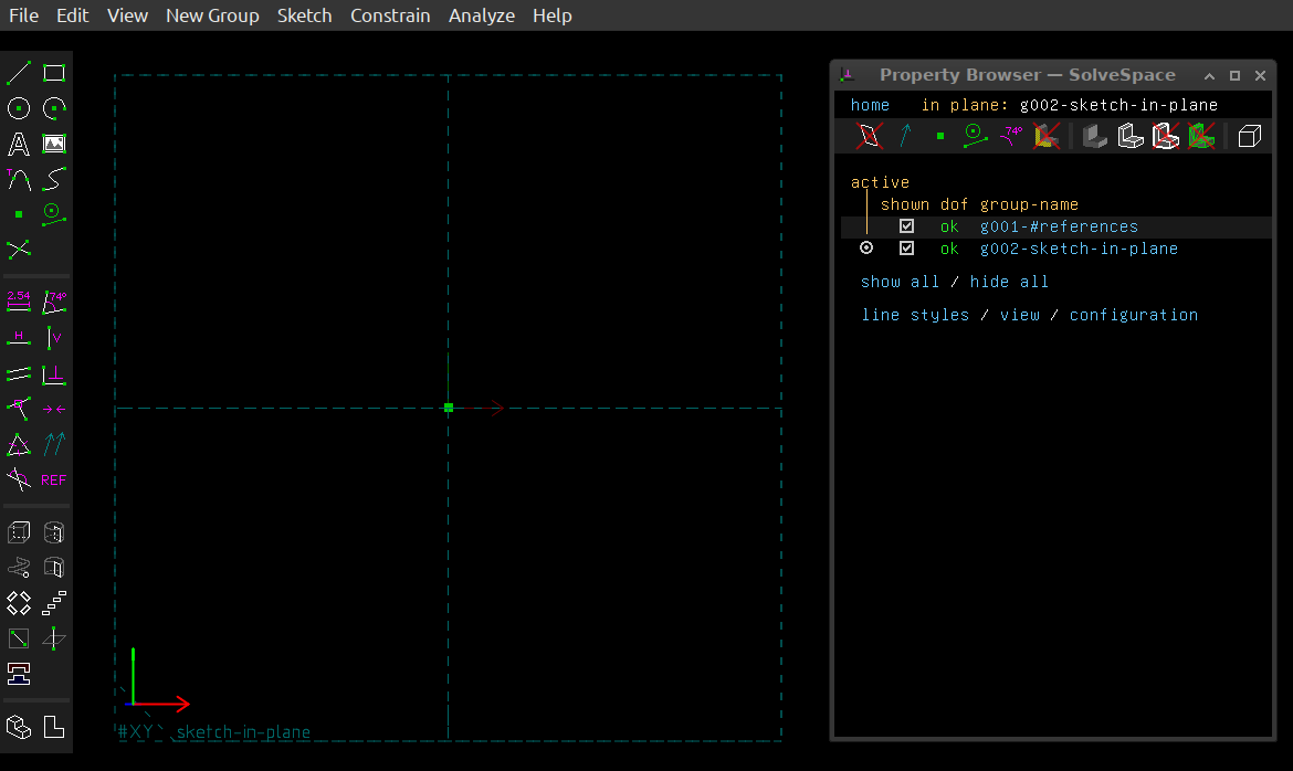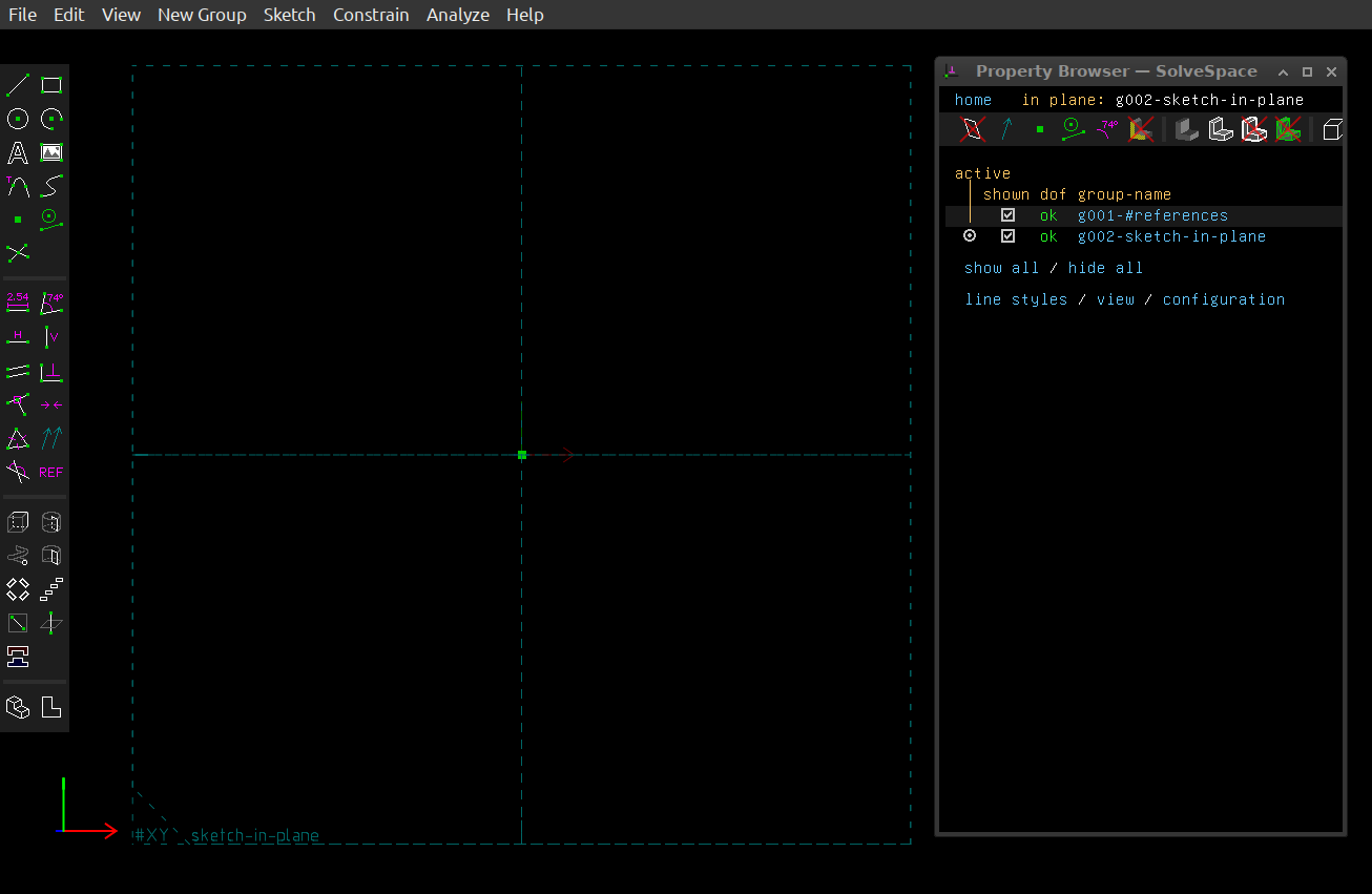 It's important to know which SolveSpace spatial plane you're sketching in, especially if you plan to 3D print what you create. In that case you will want to give a created object the most favorable orientation for the 3D printer environment. But for now, the default XY plane is fine.