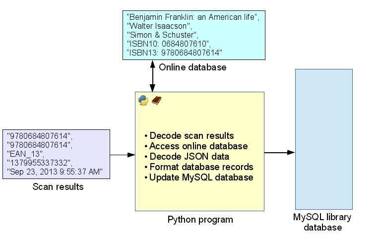 Figure 3: Transferring scanned codesC: Process and decode the results, use the scanned ISBN codes as indices to online book databases, and create library database records for inclusion in your personal library database: