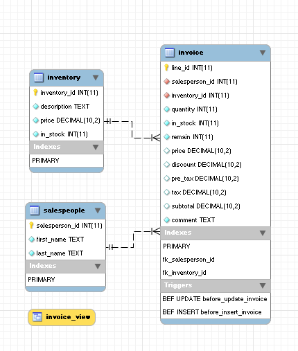A common relational design is that for an inventory control system — such a system has a strict relationship between a table describing an inventory, and tables that define adding to, and removing from, the inventory. For this tutorial I've designed a very simple relational database (relational_demo.sql) with just three tables — an inventory, a sales staff, and a sales invoice that relies on the others. When I examine my sample database in MySQL Workbench, it looks like this: