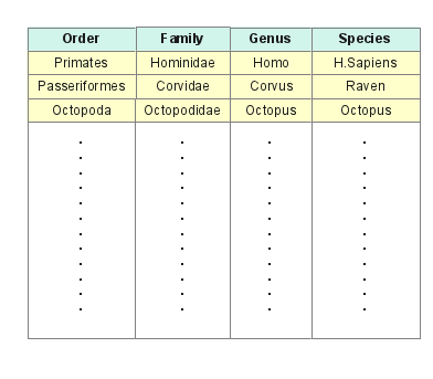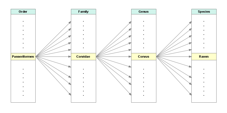 A relational database solves these problems by strictly ordering the relationship between the levels, thus preventing the entry of a species not appropriate to a given genus, or genus to a family, and so forth. Until recently such an arrangement was dearly wished for but not practical. But with a hierarchical database design based on relational principles, a hierarchy with a degree greater than my simplified diagram is possible, that can strictly relate Domain → Kingdom → Phylum → Class → Order → Family → Genus → Species.