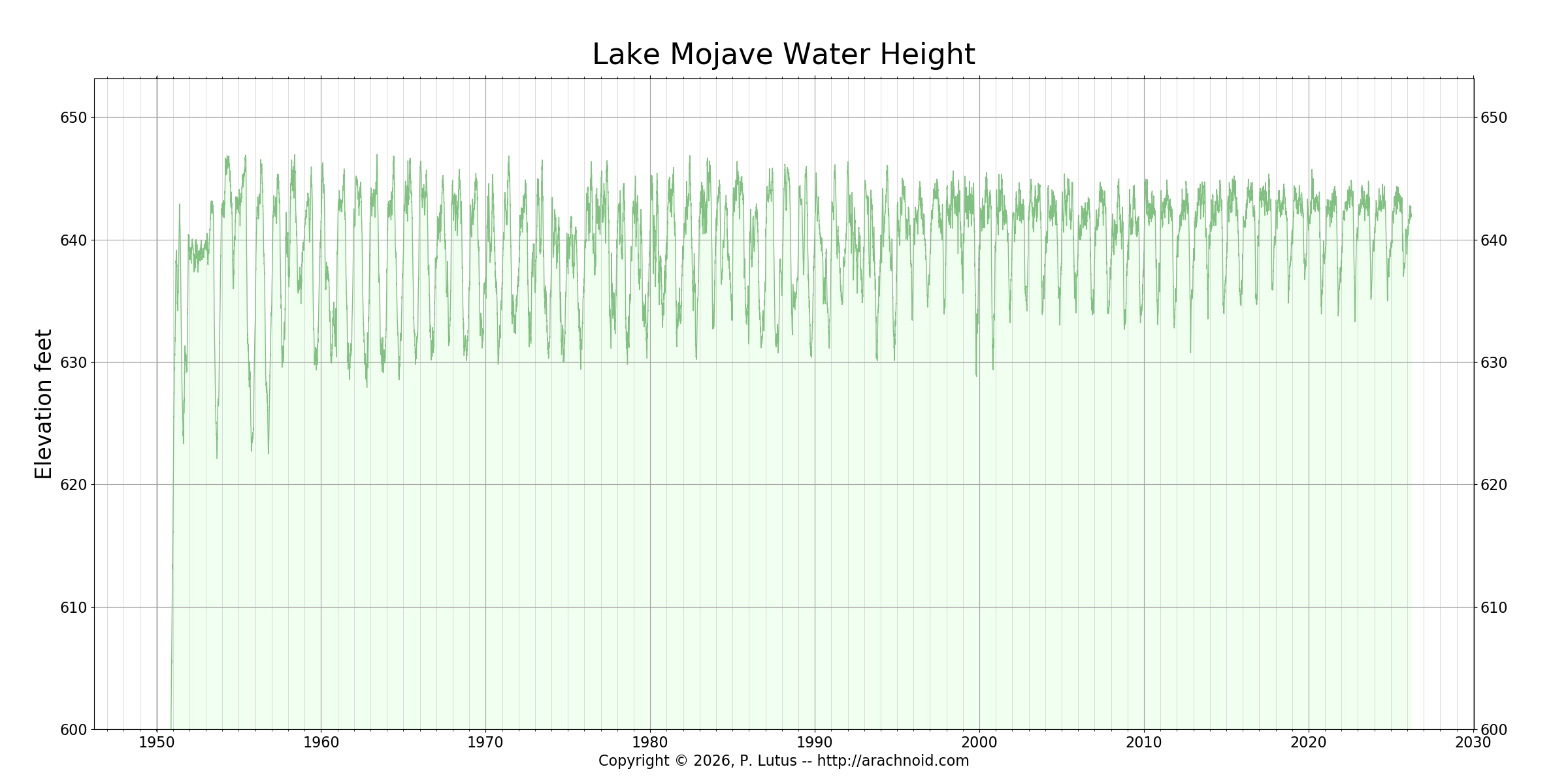 This chart is dynamically updated. This page reads data from a government archive of water heights for Lake Mohave from its first filling to the present, and draws the chart on that basis. The database, located at https://www.usbr.gov/uc/water/hydrodata/, is updated once per month. This page's graphic updates itself in step with the data source, over time giving an easy-to-interpret picture of Lake Mohave water levels. |