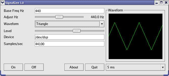 SignalGen creates any frequency between a fraction of one Hertz and an upper limit determined by your sound card's capabilities, typically about 50 KHz (accomplished by choosing the highest sampling frequency your sound card will provide, typically about 100 KHz). And, just like a hardware audio generator, it will create sine, triangle, square and sawtooth waves.