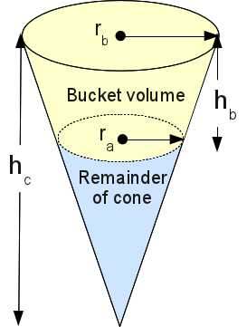 The only variable not obtained by measurement, that must be computed, is hc, the height of the hypoethetical cone that the bucket is part of. Here is an equation for hc in terms of measured values: