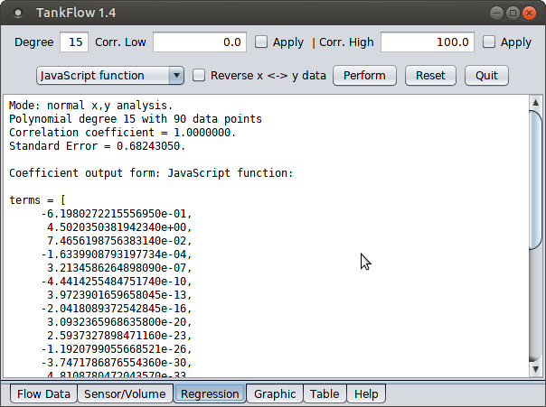 Using the polynomial regression it creates, TankFlow draws a graph and allows creation of a table, but more importantly it provides a way to export a computer language function with appropriate polynomial terms for use elsewhere. On the "Regression" tab is a list of computer languages (top left). Selecting one of the languages generates a computer code function with correct syntax, ready for export via the system clipboard into another environment. Supported languages include C, C++, Java, JavaScript and Python.