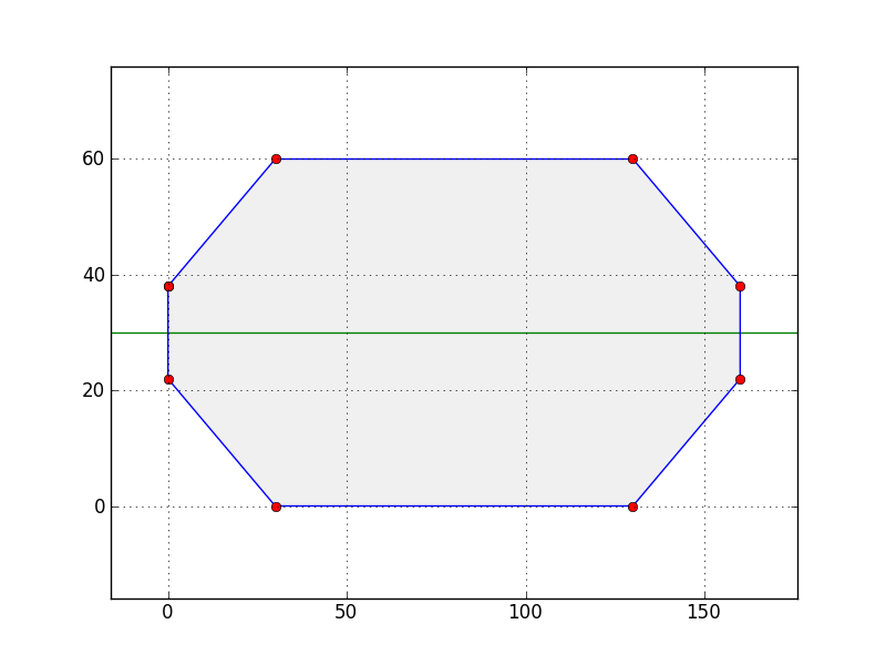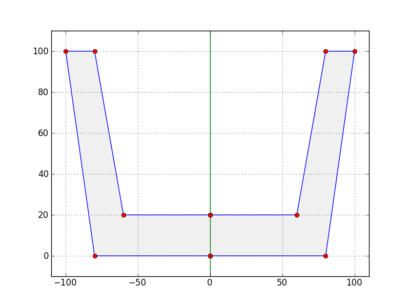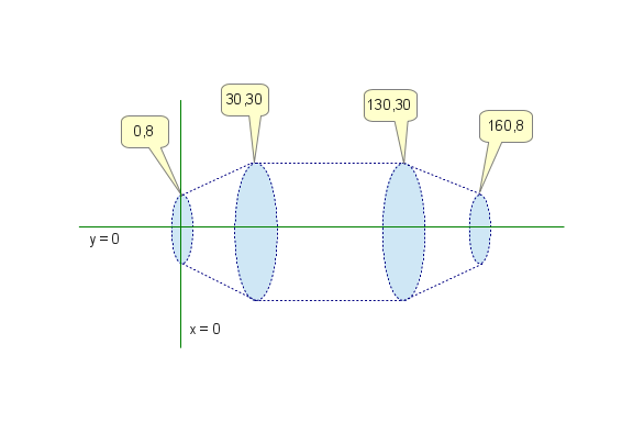 0,8 30,30 130,30 160,8Each x,y coordinate pair provided to TankProfiler describes the perimeter of a circle whose center lies at y coordinate zero, and the circle forms part of the desired tank profile. Expressed another way, each x,y coordinate pair describes a circle having radius y and centered at coordinate x,0. Like this: