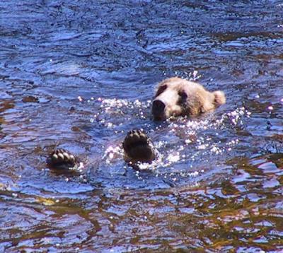 The brown bears, by contrast, did all they could to make the activity interesting. They would go to a place in the creek with a smaller density of fish, just for sport (or so it seemed). They would swim around and create a disturbance so the fish would make an opening for them, then try to stalk the fish that were appropriately evading them. Some would specialize by catching a fish, tearing it open and eating only the eggs (discarding any male salmon entirely), then abandoning the remainder of the fish and starting over. As a result the banks of the creek were littered with half-eaten fish.