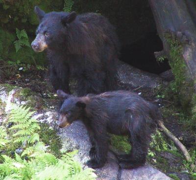 Anan Bay is becoming rather too well-known, to the degree that a permit system is in the planning stages. Even the large love boats (you know, those floating hotels?) offer their clients the chance to visit the place. You can usually identify the love-boat clients at a glance on the trail to the salmon run — they travel in an overly large, tightly packed group, walking in single file, with armed guards posted at each end of the line, each hefting a conspicuously large rifle. The assemblage looks like nothing so much as a chain gang from an old movie, with the difference that the chains are invisible ones composed of fear. Only the most demented bear would do anything but run away from this cacophonous group.
