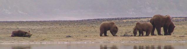 On my return to Geographic Harbor, while paddling about in my kayak, I got my answer — there she was, with three yearling cubs (picture above). On seeing them again I was pleased in ways I cannot easily describe. Then I was forced to realize how remarkable their survival had been, because over the next few minutes I watched this bear family defend themselves against an attack by a pack of hungry teenage bears (more on this later). This kind of drama is rather alien to the experience of a typical human, but in some ways I found it familiar. Bears and humans aren't that different, not really.
