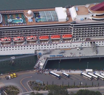How many of these people think the problem is going to go away without any effort on their part? I honestly don't know. But I do know this — people appear to be doing all they can to avoid exercise, and the ingenuity of this inactivity is, if anything, on the increase. As I hiked in the foothills of Mount Gastineau, looking down on the town of Juneau, a love boat (translation: floating hotel) showed up at the Juneau town docks and the tourists debarked to ... get some exercise? Not on your life, or, more to the point, theirs. They walked the shortest practical distance from the boat gangway to the nearest tour bus, and sat down again (see picture at right).