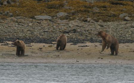 On nearby Kodiak Iskand, where hunting is allowed, there are fewer bears and much more food. As a result, the bears tend to be peaceful and not much trouble at all. While kayaking the west side of Kodiak Iskand I visited a family (of humans) who lived in a pretty, remote spot on the shore of an inlet. They allowed their small children to play outdoors without restriction. I asked the obvious question, "Aren't you worried about bears attacking your children"? "Not at all," they replied. As I paddled away in my kayak, within a mile of the children I encountered a bear eating sedge grass on the shore. He looked at me with complete passivity and resumed foraging. I thought to myself this was not at all like the bears on the Peninsula.