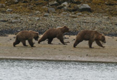Young bears, even at this age, are very vulnerable to attack by older, particularly male, bears, and I watched these three bears run away from a number of potential attackers. Another issue on the Alaska Peninsula is that hunting is not allowed, as a result there are a lot more bears than there is food for them. I watched a number of bear-on-bear attacks, some obviously stressed bears whose ribs were showing (in May), and, overall, a whole lot of bears.