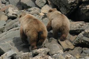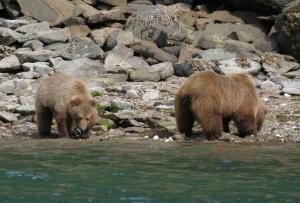 When I visit the Alaska Peninsula I try to arrive during a time of low daytime tides, so the bears will come out and dig for clams. This is fine for me, because I can paddle around and take pictures from the relative security of my kayak or even the deck of my boat if I have placed the boat well.