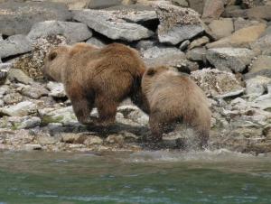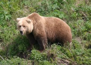 Although I don't go ashore on the Peninsula, I hike quite a lot in other parts of Alaska, and I try to make some noise as I walk along, to give the bears plenty of advance warning. While hiking this year, I had two close bear encounters, and both turned out very much as one would hope. On Bainbridge Island in Prince William Sound, while hiking back from a mountaintop, I got into some rather thick brush, very poor visibility, so I started making a lot of noise as I walked — "Hey, bear!", clapping my hands, that sort of thing — and pretty quickly came within about 50 feet of a bear. The bear quite obviously had been listening to my approach for a while and was not at all startled when I finally came into view — just as one would hope.