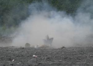 After the range was cleared of people, everyone who still had any ammunition began shooting. I started clicking my shutter. Within about ten seconds, one of the rounds nailed the barrel just so, and it completely disintegrated. As you can see, even the refrigerator the barrel stood on got split in two.