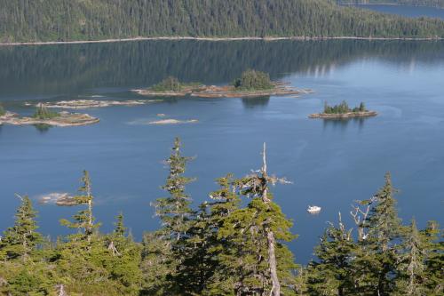 I also explored some areas on Perry Island in Prince William Sound. There is an anchorage on the west side of East Twin Bay that serves as a convenient access point for several interesting hikes. One hike, moving northwest from this anchorage, is nearly free of thick brush, and takes one to a dramatic mountaintop view of the entire western Sound.