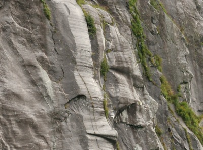 I visit places where one can follow the progress of icebergs, from the moment they break away from the parent glacier to the time when they are mere bits of melted ice, days or weeks later. One such place is Tracy Arm, north of Petersburg in southeast Alaska. Tracy Arm is a rather long passage with tidal glaciers at the head, so one sees various stages of iceberg melting while traveling along the passage. During the summer only a few icebergs get all the way out of Tracy Arm into Stephens Passage (but this has not always been true — years ago, all of Tracy Arm was filled with ice, and one can see scoring marks made by rocks carried along with the glacier as it made its way to open water — see picture this page).