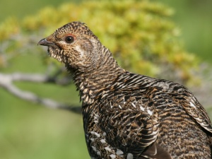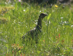 After taking a few pictures I decided to do a somewhat mischievous experiment. I tried making mama ptarmigan's call, and I managed a reasonable imitation. One of the chicks then became completely confused and made a beeline for my shoes, at which point mama flew straight toward me, wings outstretched, trying to put herself between me and her chick. Both arrived at once, between my shoes, mama planting herself over her chick and raising quite a ruckus. I quickly stepped away and resolved not to imitate rock ptarmigan calls any more.