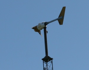 Someone got the idea to install a high-powered windmill, on a tall mast by itself, hoping this would alleviate the power problem and conserve the propane. This sort of approach must seem perfectly sensible until the wind starts to blow. In some unexpected high wind, the high-tech 1500-watt windmill lost its blades (see photo this page).
