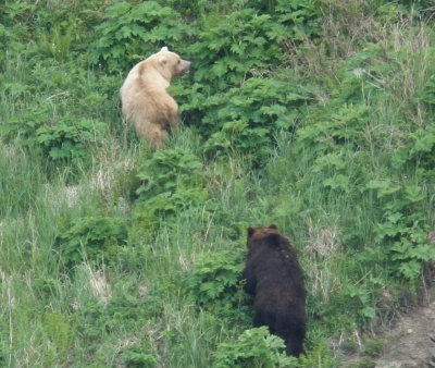 This is Othello, a relatively young, inexperienced bear, who wants to be the alpha male but may not have the strength or experience to carry it off. Note the scar, the result of a serious fight earlier in the day with George, his primary adversary. Note also that Othello is a brown bear (species) with black fur (color). One can't distinguish bear species by their fur color. There are black brown bears, and brown black bears, if you follow me.
