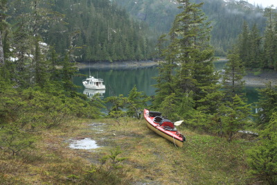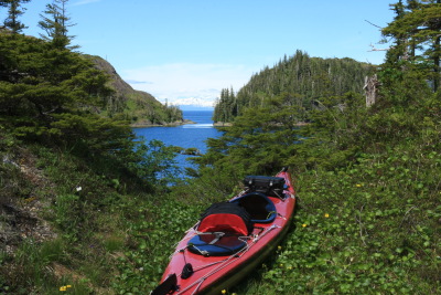 In brushy locations it has occurred to me that I can see a lot more of Alaska by moving my kayak from salt water to fresh water and paddling around a lake or river, instead of trying to explore the land on foot. I have a rather nice Kevlar kayak that only weighs 38 pounds, relatively easy to drag across the land (and that is surprisingly durable). I am rather lazy — obviously I could pick up the kayak and carry it, but in most cases I've weighed the kayak down with camera gear and supplies, and in many locations the majority of the drag is across grassy terrain. Well, that's how I rationalize abusing my kayak.
