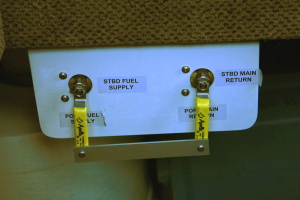 At the next opportunity (that evening at anchor) I installed a metal bar that forces the valves to move in synchrony (see picture this page). I recommend this fix to any boat owners who have fuel valves side-by-side as shown.
