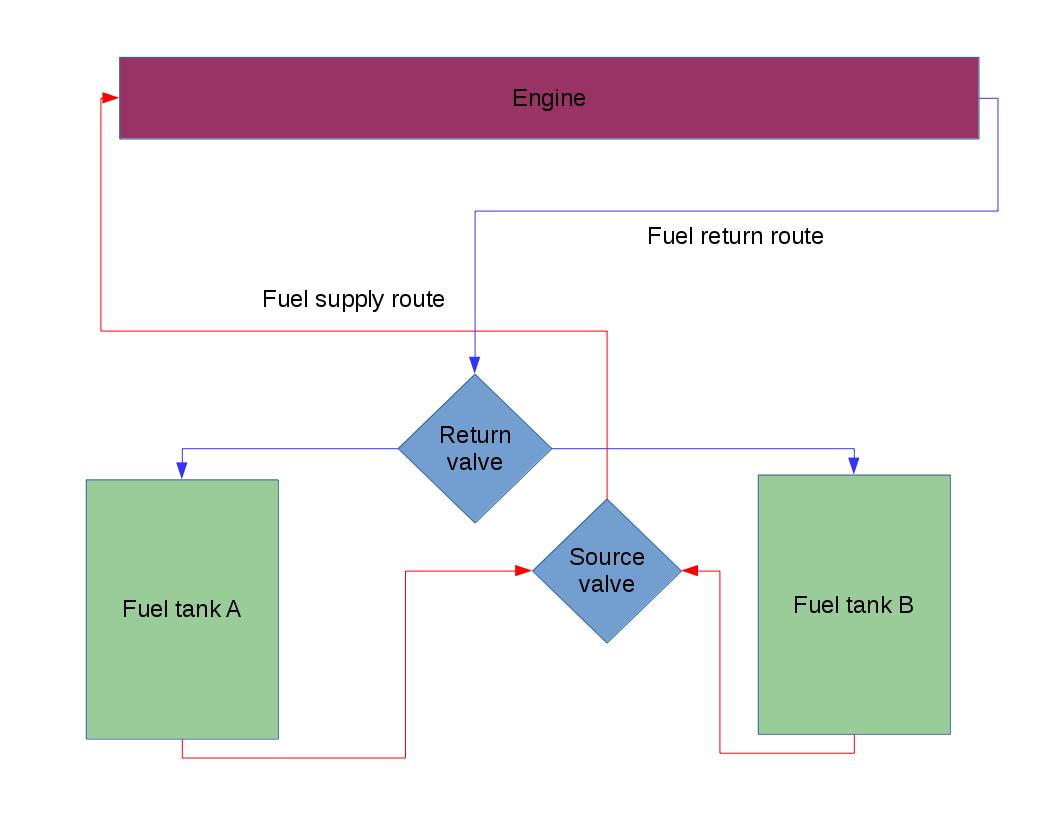 Typical modern diesel fuel system (valves must be kept synchronized)Since the day I bought this boat, I've known the fuel valves had to be kept in sync, and if not, fuel would be drawn from one tank and flow back to the other, but I didn't think very hard about what that meant. In a vague way I thought all the fuel might end up in one tank. But I overlooked the role of Murphy's Law in all this — that the crossed-valve scenario might happen at the worst possible time.