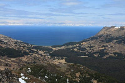 When I first visited Onion Bay years ago, I tried hiking to the northeast of the anchorage (see Figure 1), but the terrain there is very brushy and I kept encountering bears while moving through shoulder-high brush, a risky activity. Since then I've been developing a trail to the Southwest of the best anchorage that leads to a peak with a nice view (Figure 1, the peak marked "1603"). While visiting this peak, I've noticed a likely route for a hike across reasonably level terrain from Onion Bay to Shelikof Strait to the Northwest.