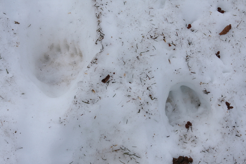 A remarkable image of a brown bear print (left) and a moose print (right) in the snow near Homer