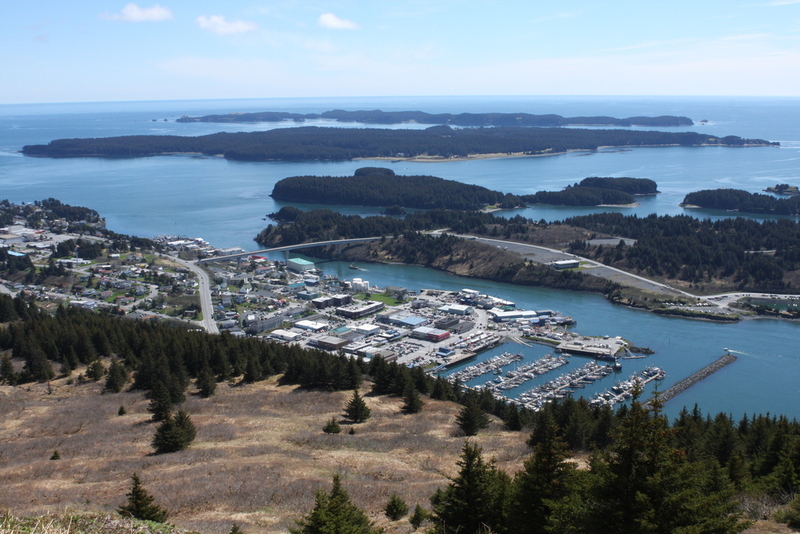 Kodiak City on a sunny day, as seen from the top of Pillar Mountain