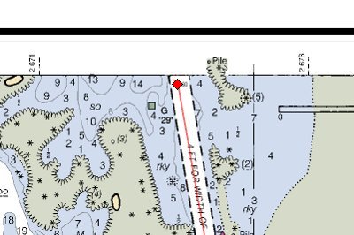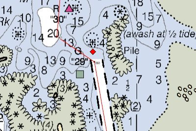 By looking closely at the quilted image above and by comparing it to the two images above it, you can see the transition line between the two original charts. In this case, the quilted display prevents a nasty surprise in which a dredged channel abruptly ends with a sharp turn to avoid a rock, and where by chance one chart ends and another begins. I can't tell you how many times I've almost plowed into that rock while waiting for the prior program to switch charts.