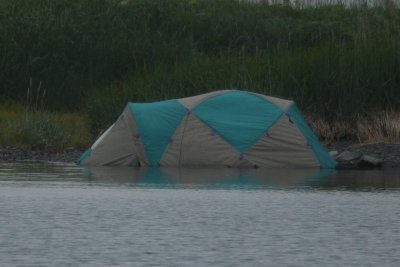 After a moment's observation, I took the picture in Figure 1. And why did I take this picture — isn't Figure 1 the most ordinary scene, a tent on a beach commonly used by kayakers? What could possibly be less interesting than a dumb tent on a beach? The answer is that I knew the tent would be underwater within four hours and I wanted to record a "before" shot, so people could see how innocent everything looked beforehand.