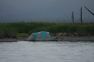 These are reasonable questions, but in the context of an Alaska wilderness site, I acted appropriately. First, if I went ashore to move the tent and if the kayakers were asleep inside (something I didn't know), they would have the right to shoot me on the spot. Later, they could say, "I thought it was a bear outside my tent, instead it was an idiot — I shot him, so sue me." As to the kayaks, an observer might well draw the conclusion that I was trying to steal two rather nice boats, and my explanation might ring hollow — "I was keeping them from drifting away." Sure, buddy.