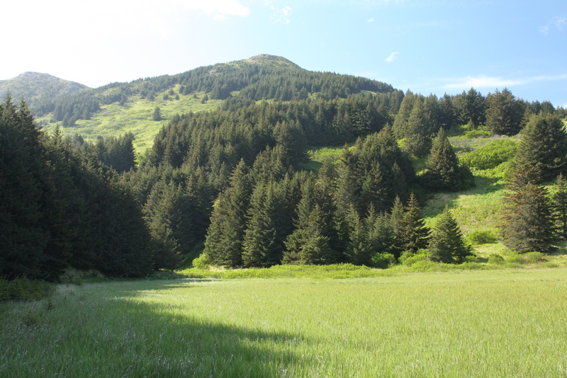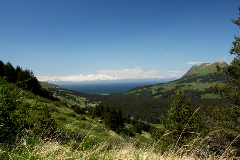 When I visit Onion Bay on Raspberry Island, I make time for a nice hike through a pretty valley that runs from Onion Bay on one side to Shelikof Strait on the other. Here is a picture of the valley, as seen from a nearby mountain: