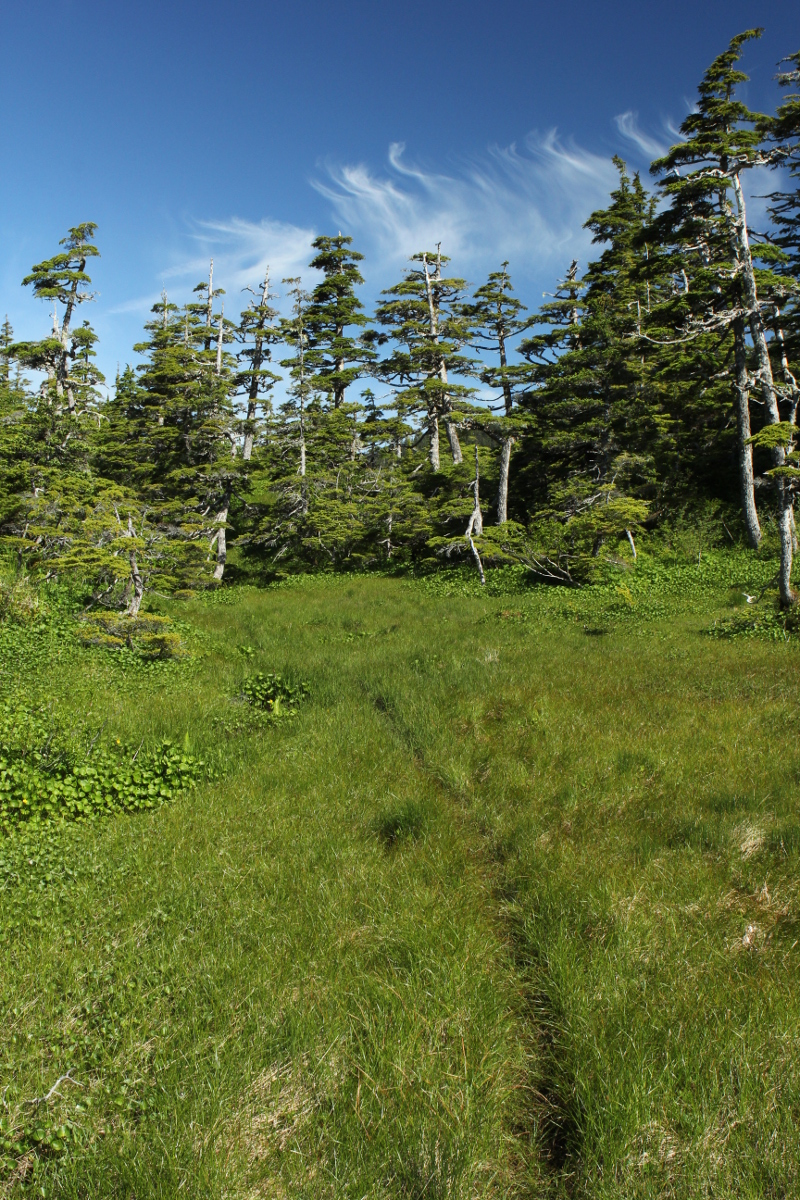 The new environment has easier hiking, in mountainous terrain east of the anchorage. A nice series of open meadows leads one to a saddle area between two peaks, perfect for camping. The meadows look like this: