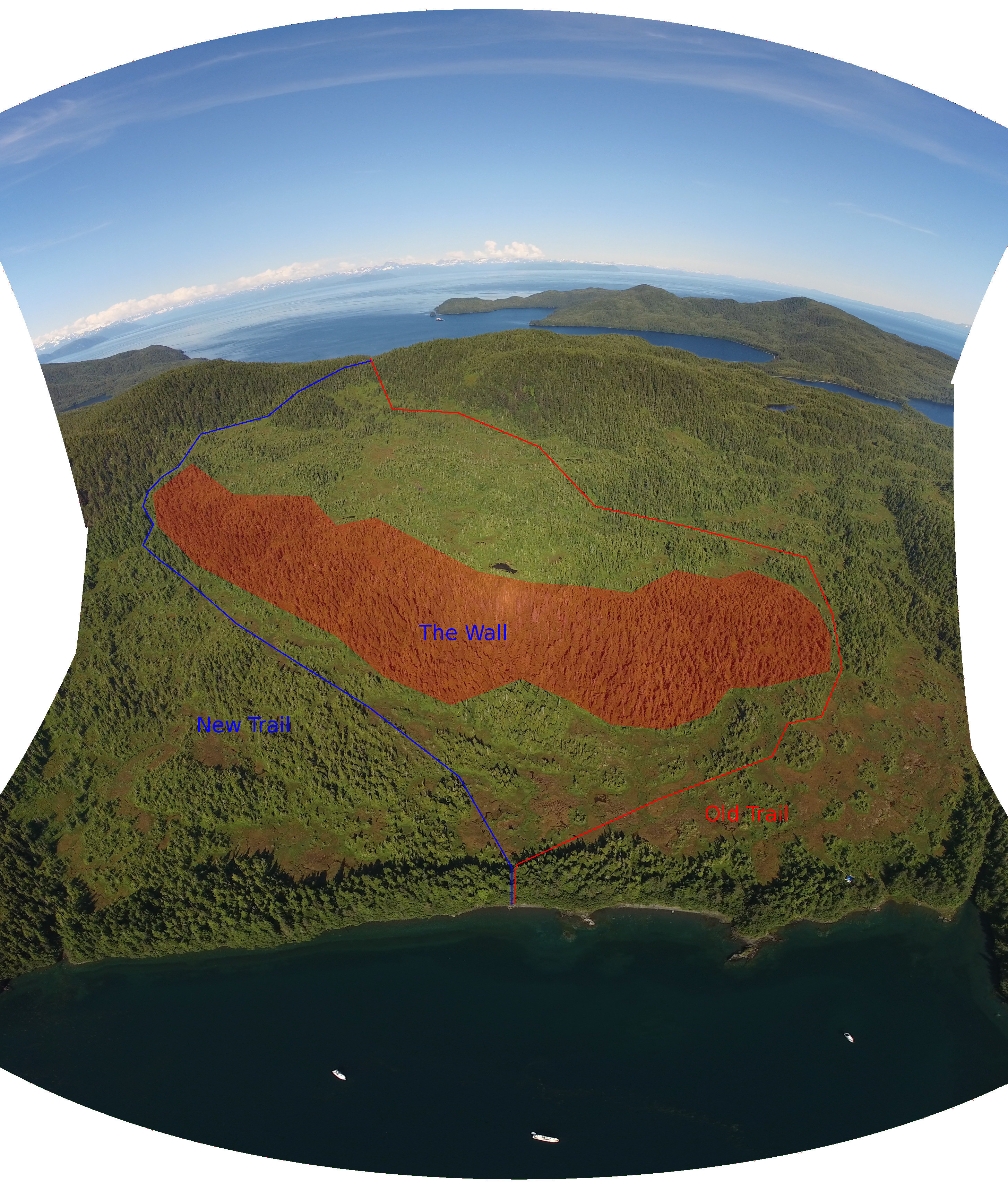 I've been visiting Cabin Bay for several years now, and this season I scouted a new trail. My old trail (shown in red in the image below) is a rather difficult route that involves a long diversion south of a long, steep feature I call "The Wall" shown in the graphic below. This year, with the advantage of quadcopter aerial imagery, I found a more efficient trail (shown in blue) that takes me through a comparatively easy ascent located to the north of the wall.