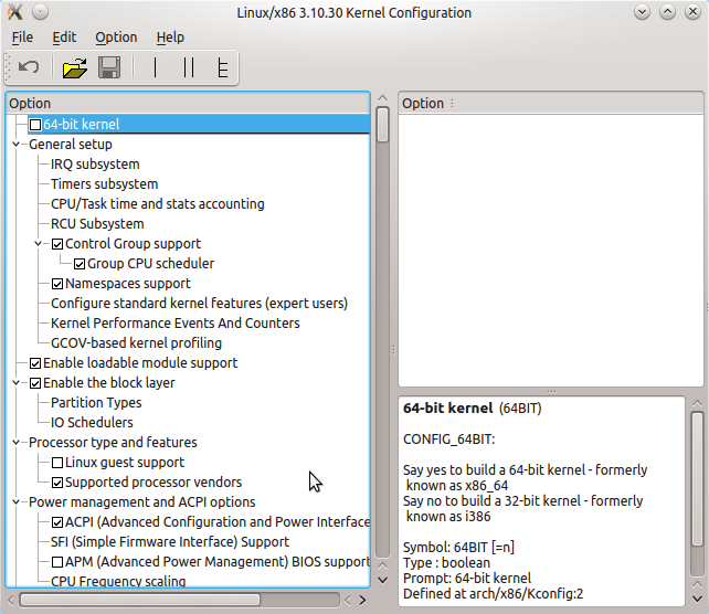 Make any option changes you require, remembering that many of the pre-existing settings resulted from a great deal of thought and work (meaning don't change things you don't understand). In my case, to make desktop operation possible, I needed to add SATA drive support, and the drivers needed to be statically linked.