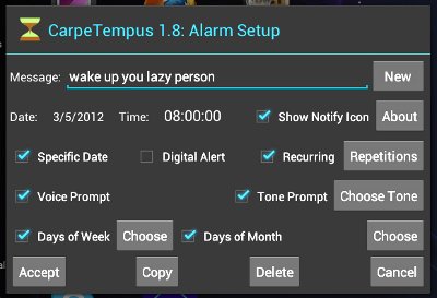 - When it's time for CarpeTempus to alert you, it will speak the message you choose, or play an alarm ringtone, or play a piece of music you choose.