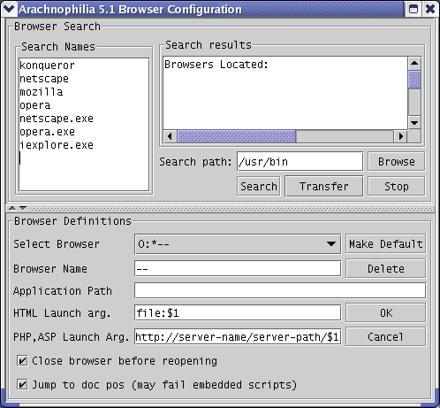 First, if the default search path doesn't look right for your system, choose an appropriate one, either by typing it in or by using the "Browse" button. On Windows systems, most browsers are located in a directory named "/Program Files". On Linux systems of recent vintage, it will be "/usr/bin". Macintosh users will probably see a default of "/Applications". One of these alternatives will most likely appear automatically based on your operating system. Having chosen an appropriate search path, press "Search." The browser search engine will search for any of the browser names listed at the left (and you can add to the list). With any luck, one or more browser paths will appear in the list at the right. To transfer the results to your personal browser list, press "Transfer", then "OK." Then, to view your page, press the preview button () or Ctrl-P again.