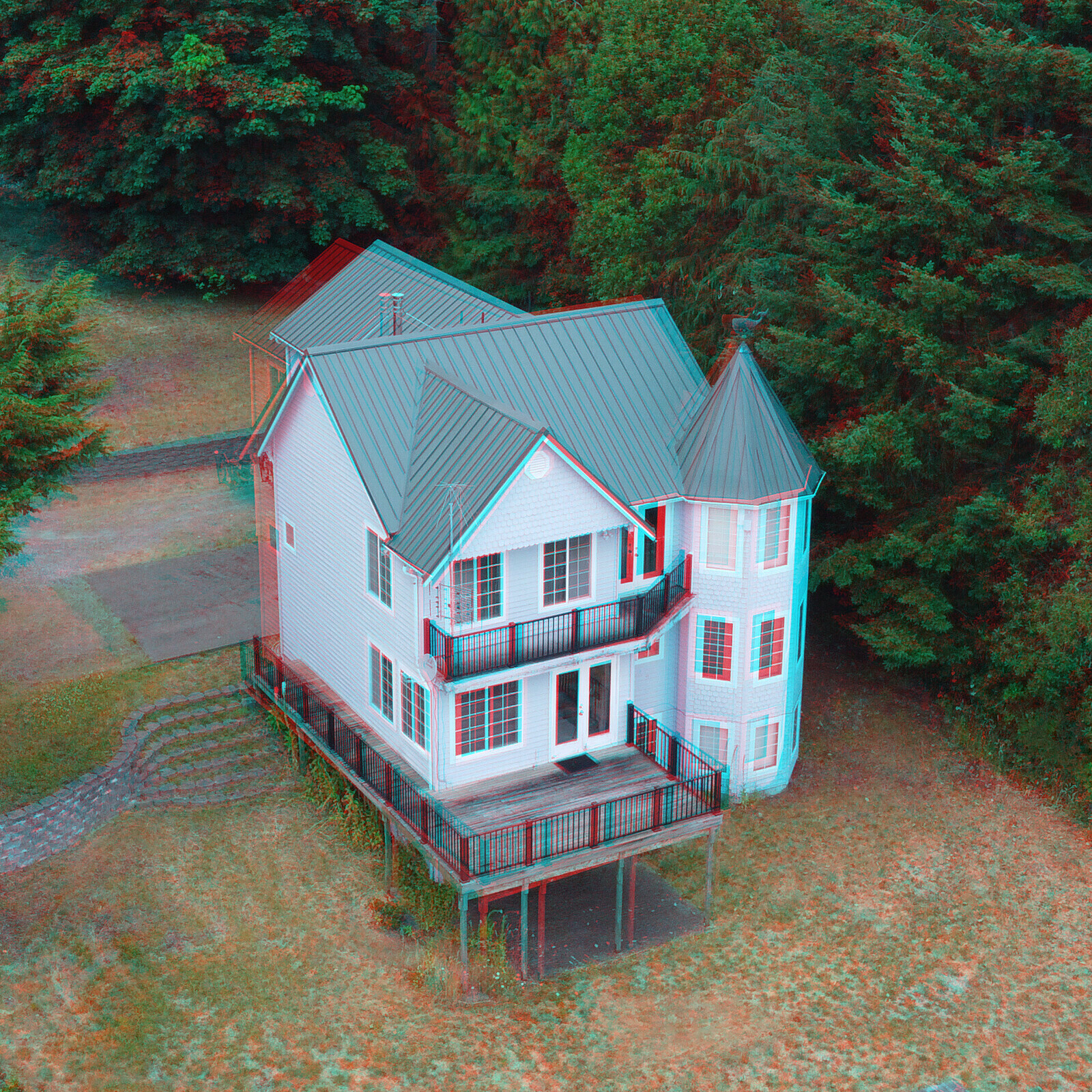• If you intend to make a full-color 3D image, avoid subjects that include bright saturated colors, red and blue in particular. A better subject — one with subdued colors, particularly shades of brown and/or green — can produce satisfactory color 3D images, as with the earlier house image.