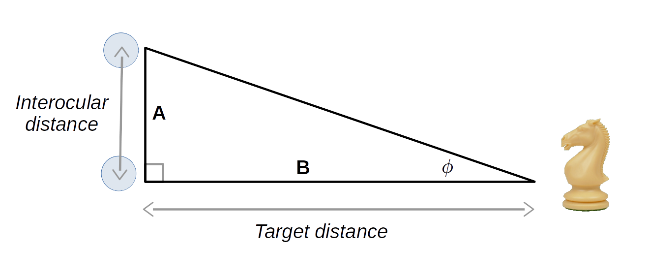 Let's work one example problem. Let's say we're looking at a chessboard sitting on a table. Let's say the chessboard is 50cm distant from our eyes and our interocular distance (distance between our eyes) is 6.3cm. The computed value for Φ is therefore: